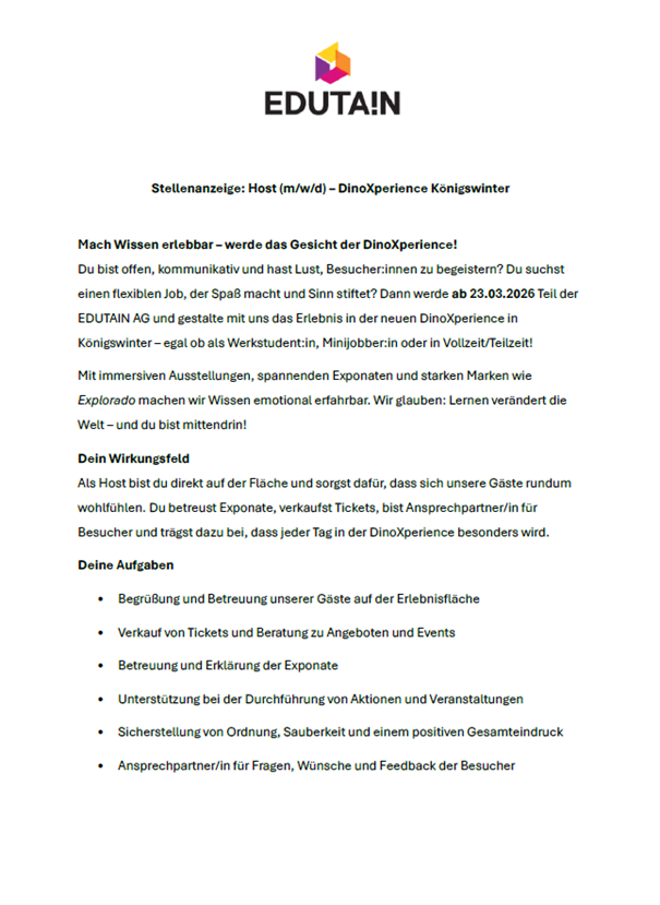 Bei der EDUTAIN AG gestalten wir immersive Erlebnisse, die Menschen begeistern, inspirieren und zusammenbringen. Dafür suchen wir neugierige Köpfe, kreative Macherinnen und Macher und echte Teamplayer, die mit uns die Zukunft des Edutainments formen möchten.