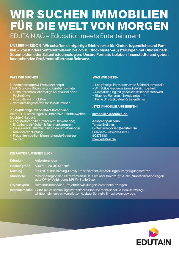Wir entwickeln einzigartige Erlebniswelten für Kinder, Jugendliche und Familien – von Museen über Ausstellungen bis hin zu interaktiven Entertainment-Formaten. Dafür suchen wir Immobilien, die wir mit neuem Leben füllen und zu Orten voller Inspiration machen.